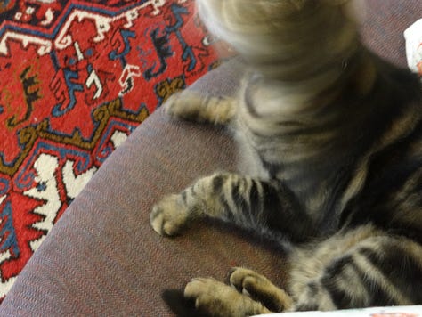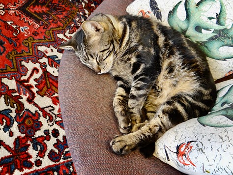 Surrounded by books at his store in midtown Sacramento, his joy is matching a book with a collector. Sunlight spills through Venetian blinds casting diagonal patterns across rows of vertical spines. In a room filled with promise, color and texture, including jelly beans and ubiquitous cat. The tactile feel of pages, the smell of ink on paper, meticulous binding, typography, design, illustrations are artful elements that enrich my experience of the content within. An afternoon here is bliss.